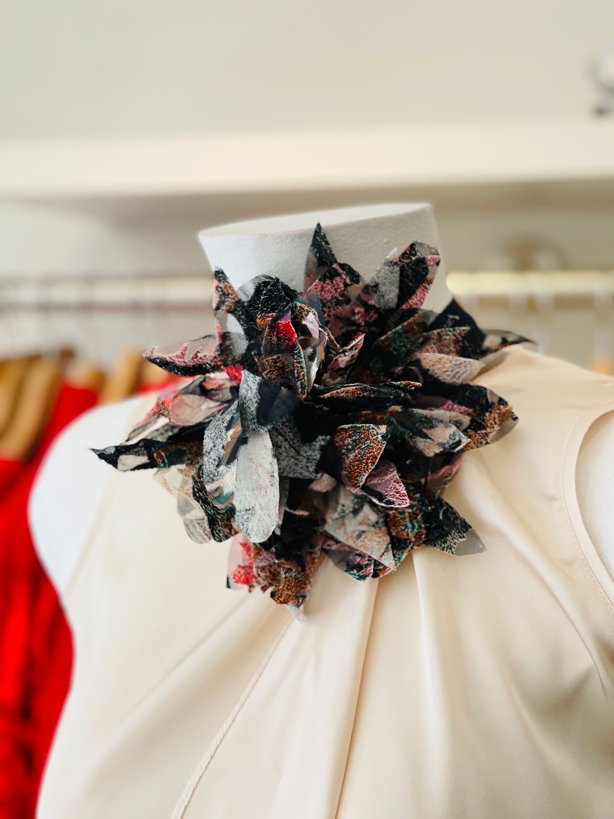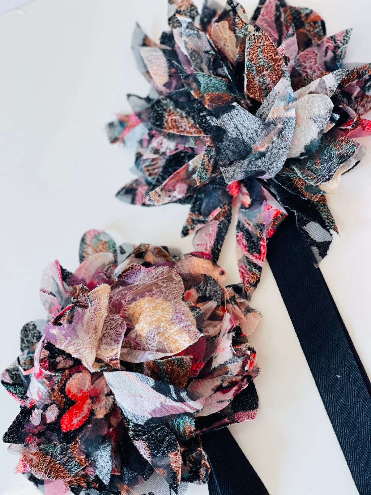 Elaborado a mano en delicadas capas de tejido translúcido que crean una flor única en textura y volumen. Sus suaves matices en tonos rosados y grises evocan feminidad y sofisticación, mientras los lazos de satín aportan un toque de movimiento y encanto. Un accesorio versátil que transforma cualquier look con la elegancia artesanal de Bettina Spitz.