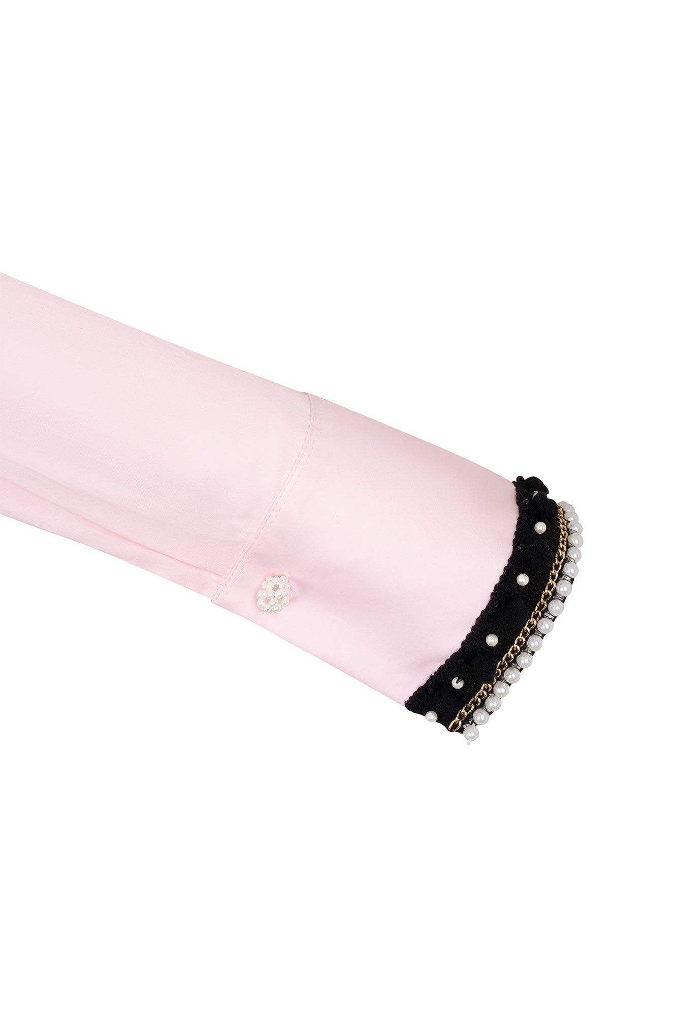 Camisa rosada de silueta recta y cuello estructurado se reinventa con un detalle encantador: mancornas decorativas en contraste negro con apliques que combinan brillo y textura. Un básico refinado que eleva cualquier look. El equilibrio perfecto entre lo formal y femenino.