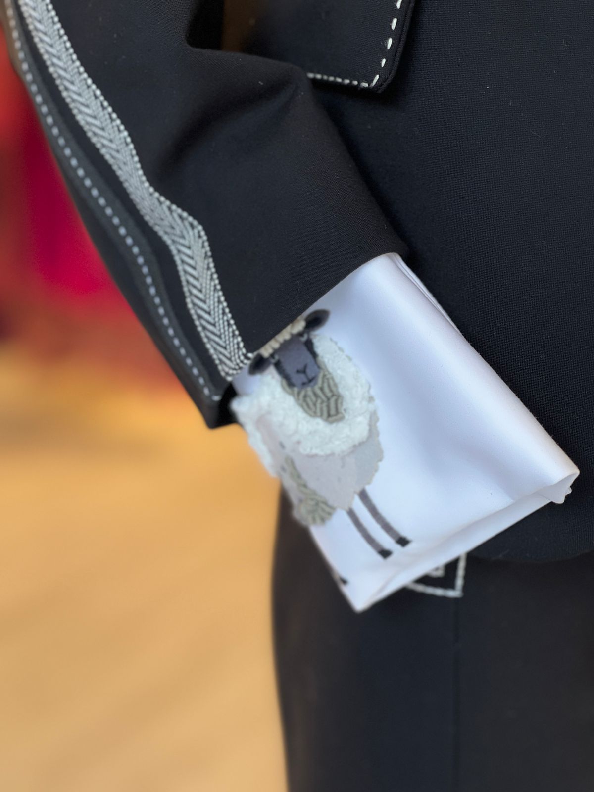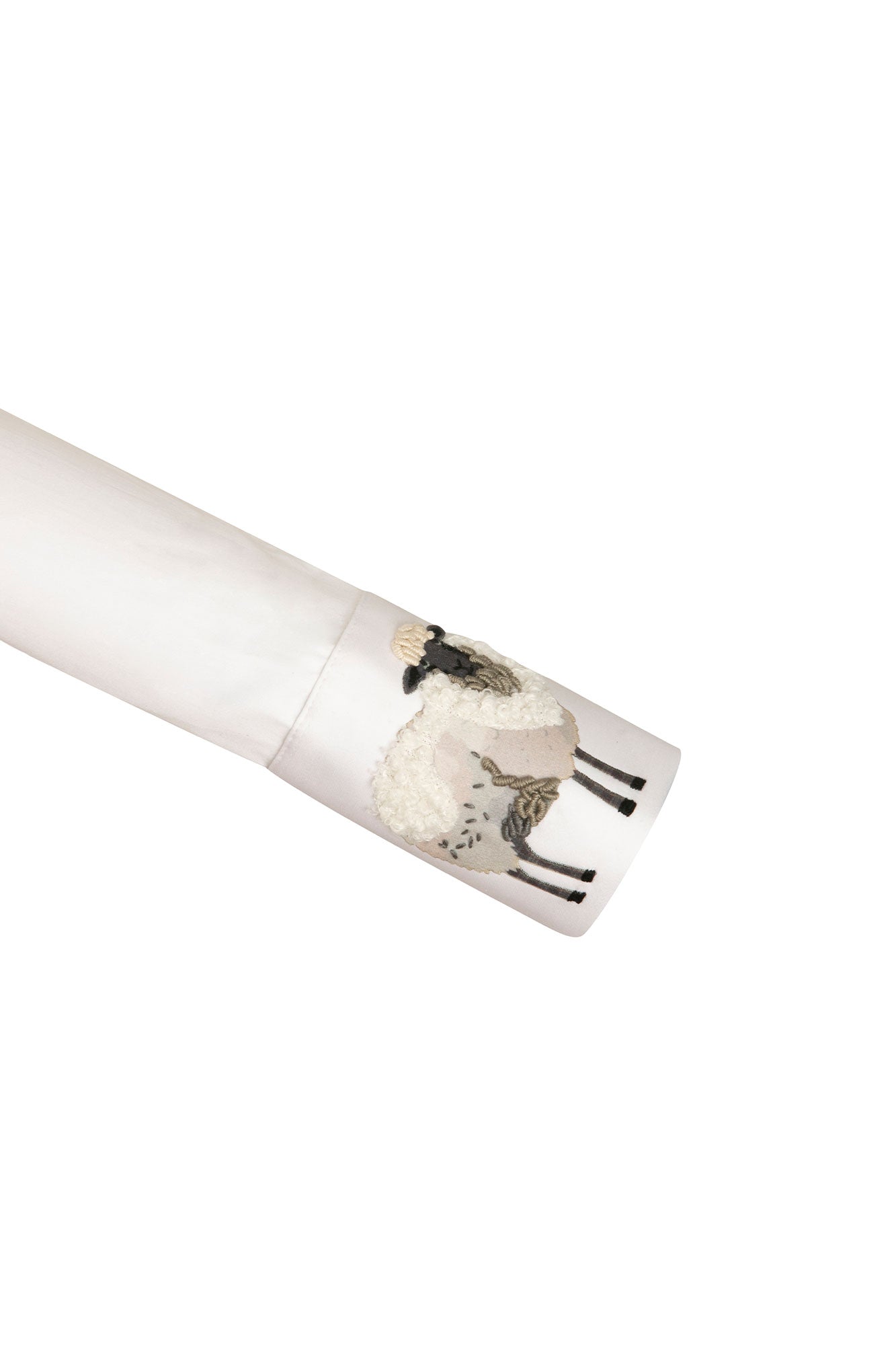 Una reinterpretación contemporánea de la camisa clásica. La Camisa Sol se distingue por su confección impecable y los detalles inesperados que evocan el sello artesanal de la marca. Los puños adornados con bordados de ovejas aportan un toque lúdico y distintivo, mientras el cuello con pespuntes finos realza su elegancia discreta. Una prenda versátil que combina humor, arte y sofisticación, ideal para elevar un look cotidiano o acompañar piezas más estructuradas.