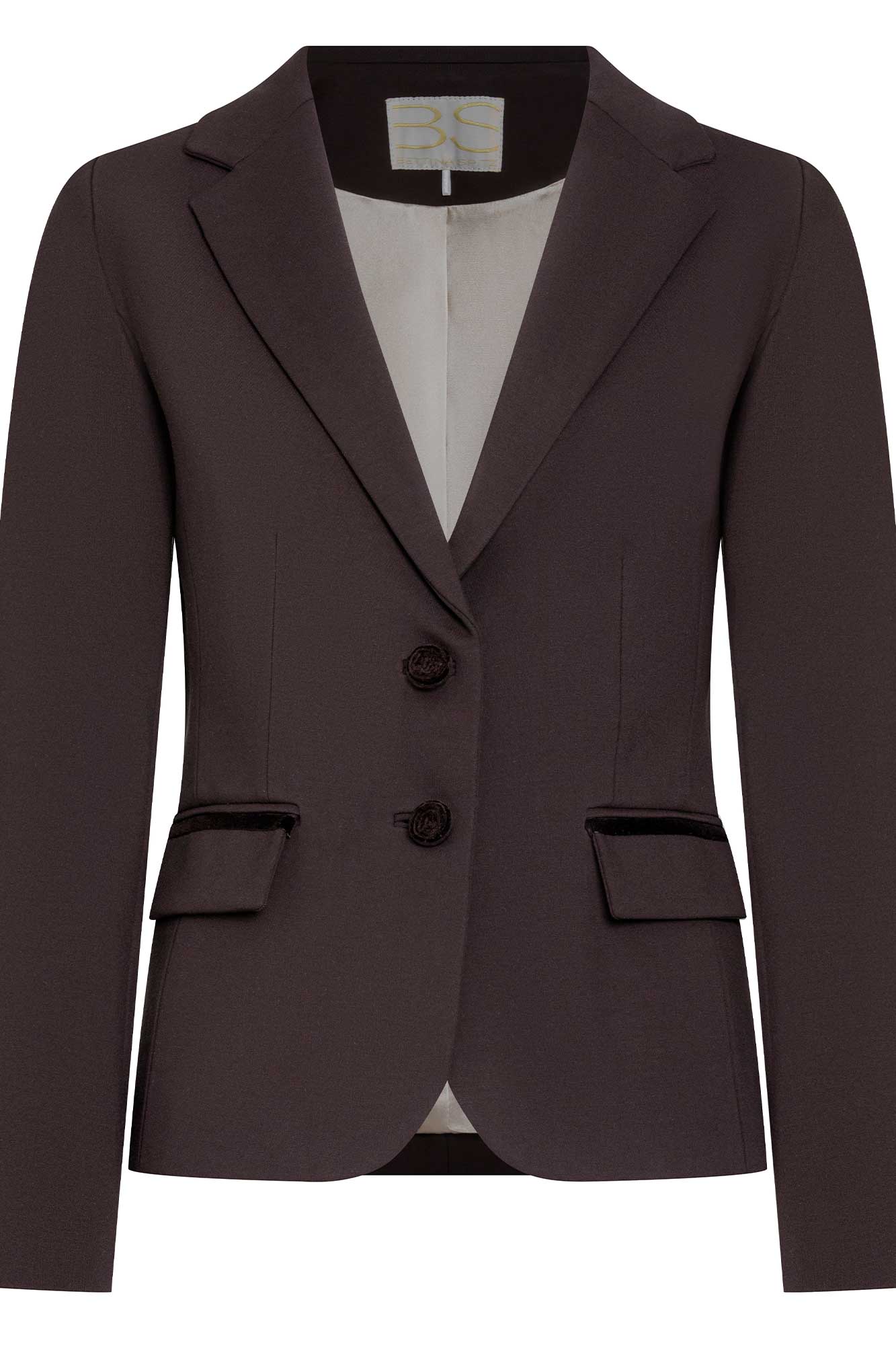 Blazer estructurado de corte clásico con solapas y botones forrados. Delicados detalles en terciopelo en los bolsillos que aportan un toque de sofisticación.