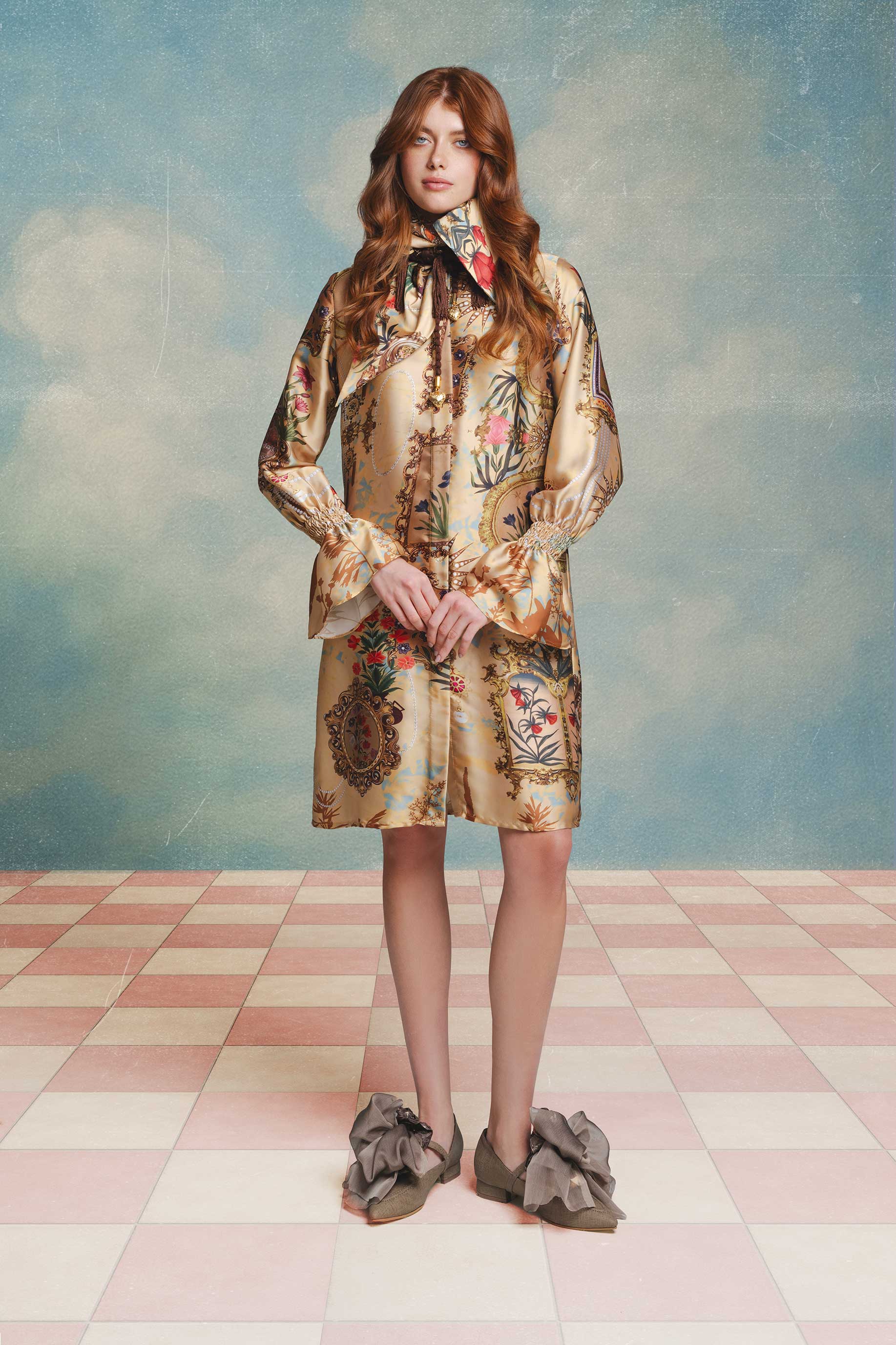 Blusa larga en satín con cuello tipo pañuelo y estampado en marcos de nuestra colección Maria Antonieta. Su silueta fluida y puños amplios con frunce aportan movimiento y elegancia.