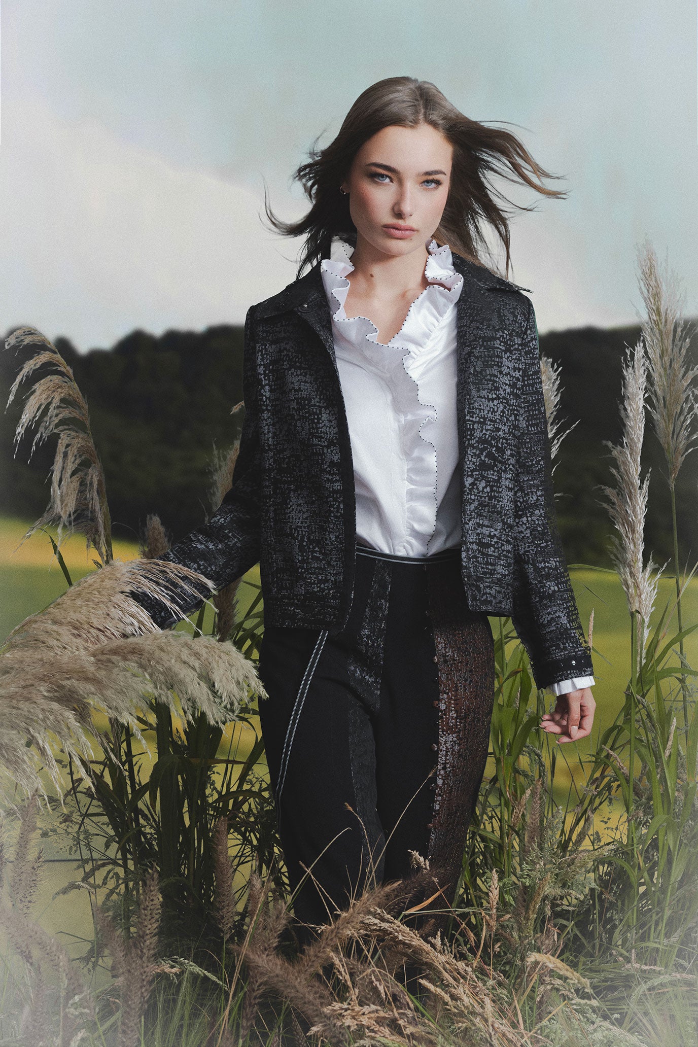 Pantalón Milo ancho negro, elaborado en combinación de tres tejidos que contrastan texturas y matices metálicos, creando un efecto visual sofisticado. Su silueta amplia estiliza la figura, mientras los detalles en costuras visibles y aplicaciones laterales reflejan el sello manual y contemporáneo de Bettina Spitz.