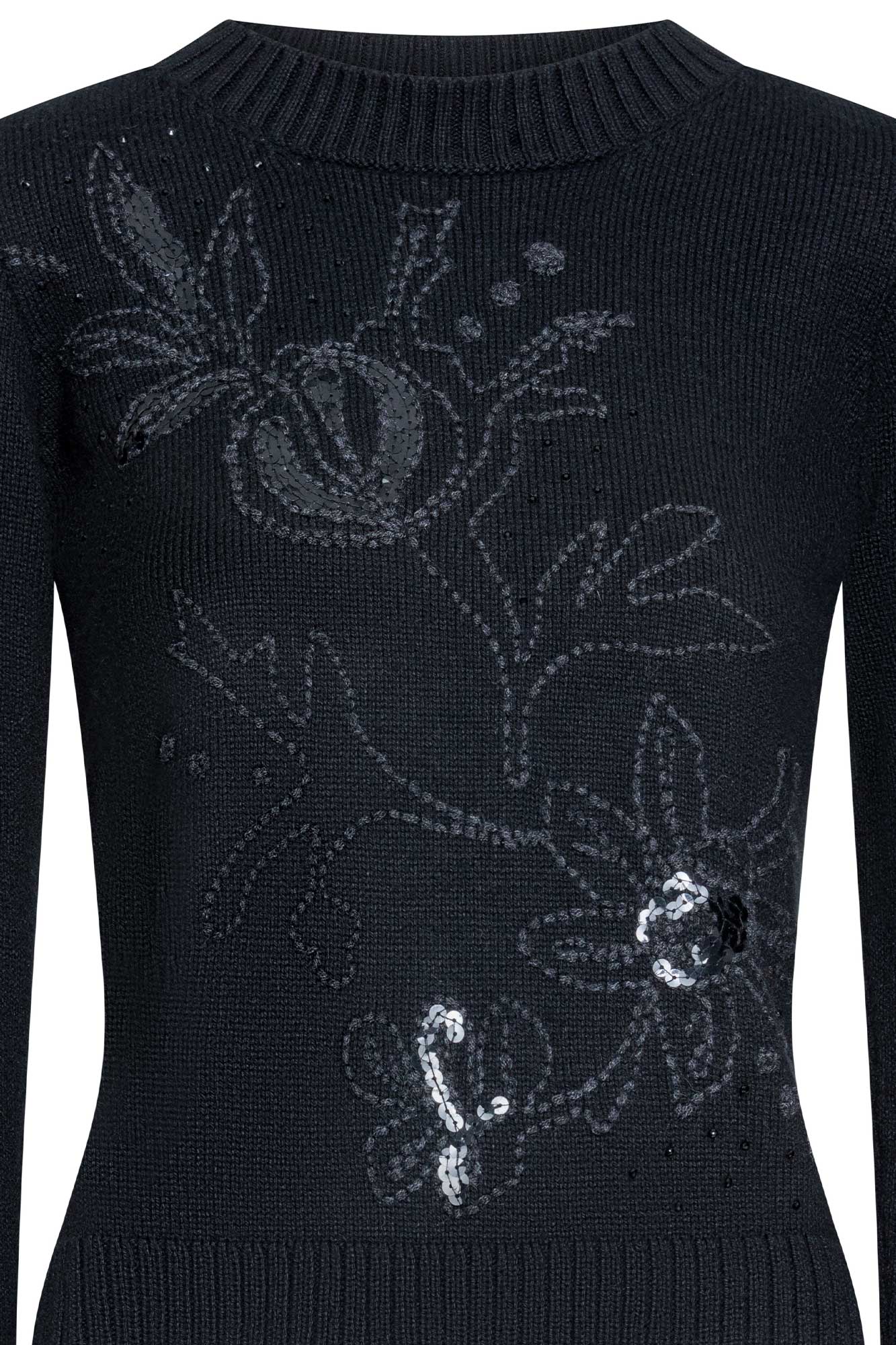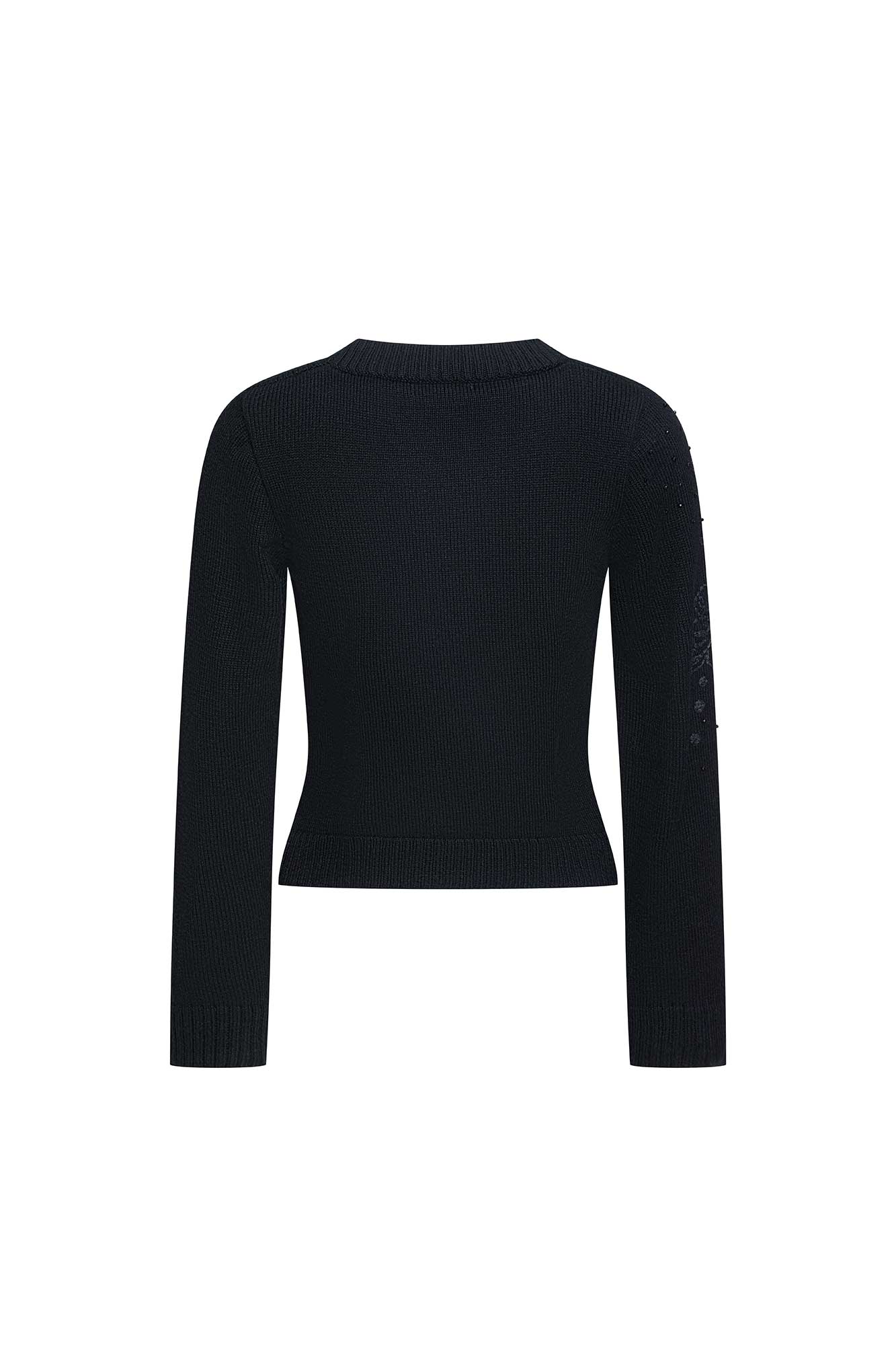 Saco tejido en punto fino con bordado floral tonal y sutiles apliques de lentejuelas que añaden brillo discreto. Su silueta ajustada realza la figura manteniendo un estilo clásico y sofisticado.