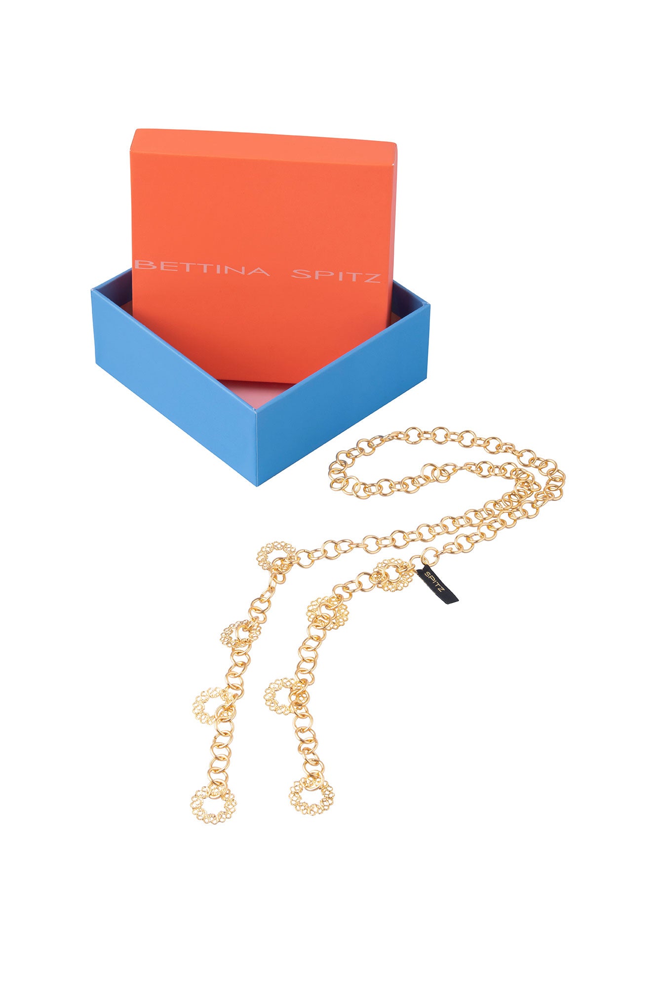 Collar de cadena dorada con diseño de aros entrelazados que aportan textura y movimiento. Su acabado elegante y atemporal lo convierte en el complemento perfecto para realzar looks cotidianos o acompañar prendas especiales con un toque refinado.
