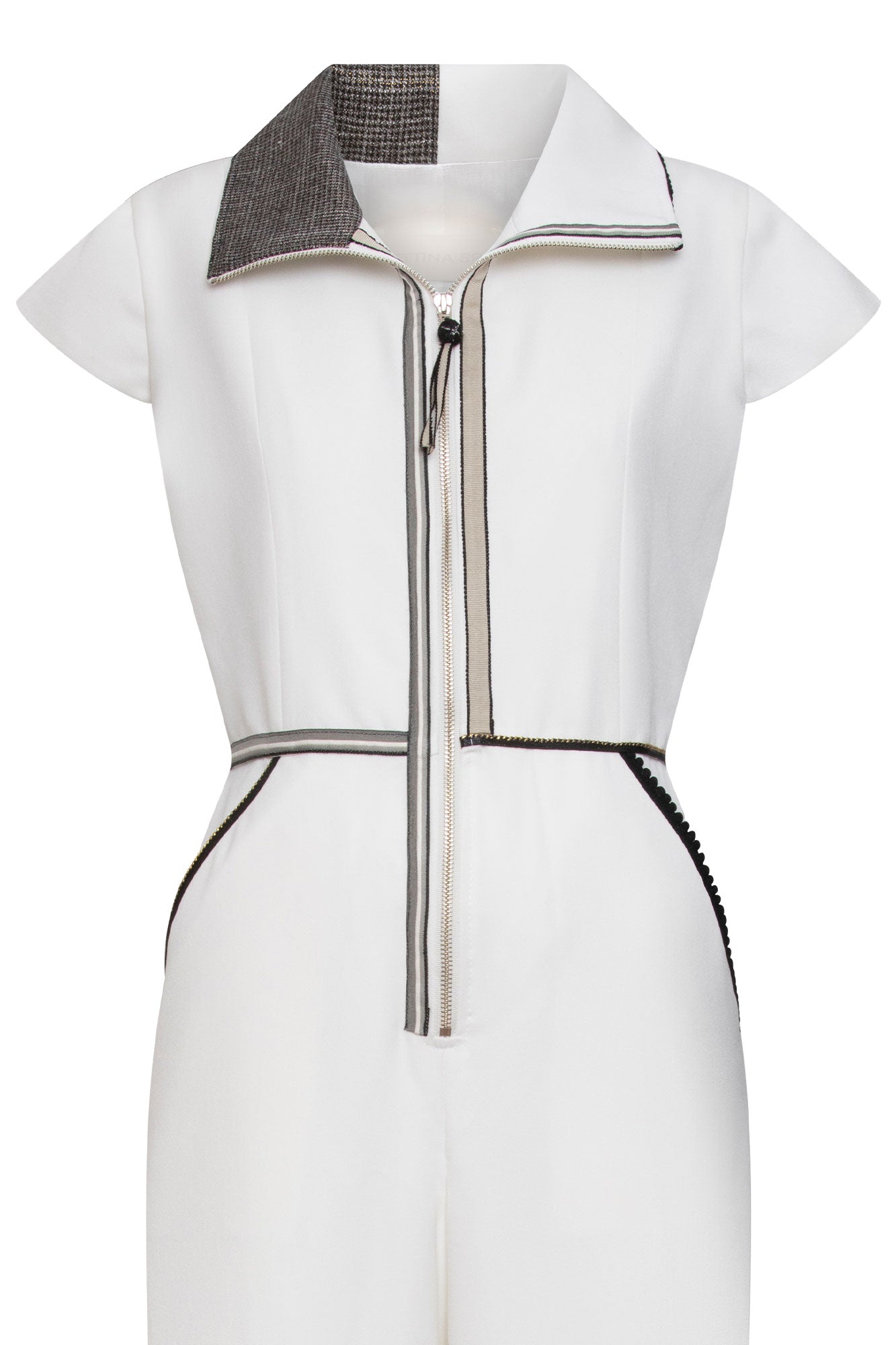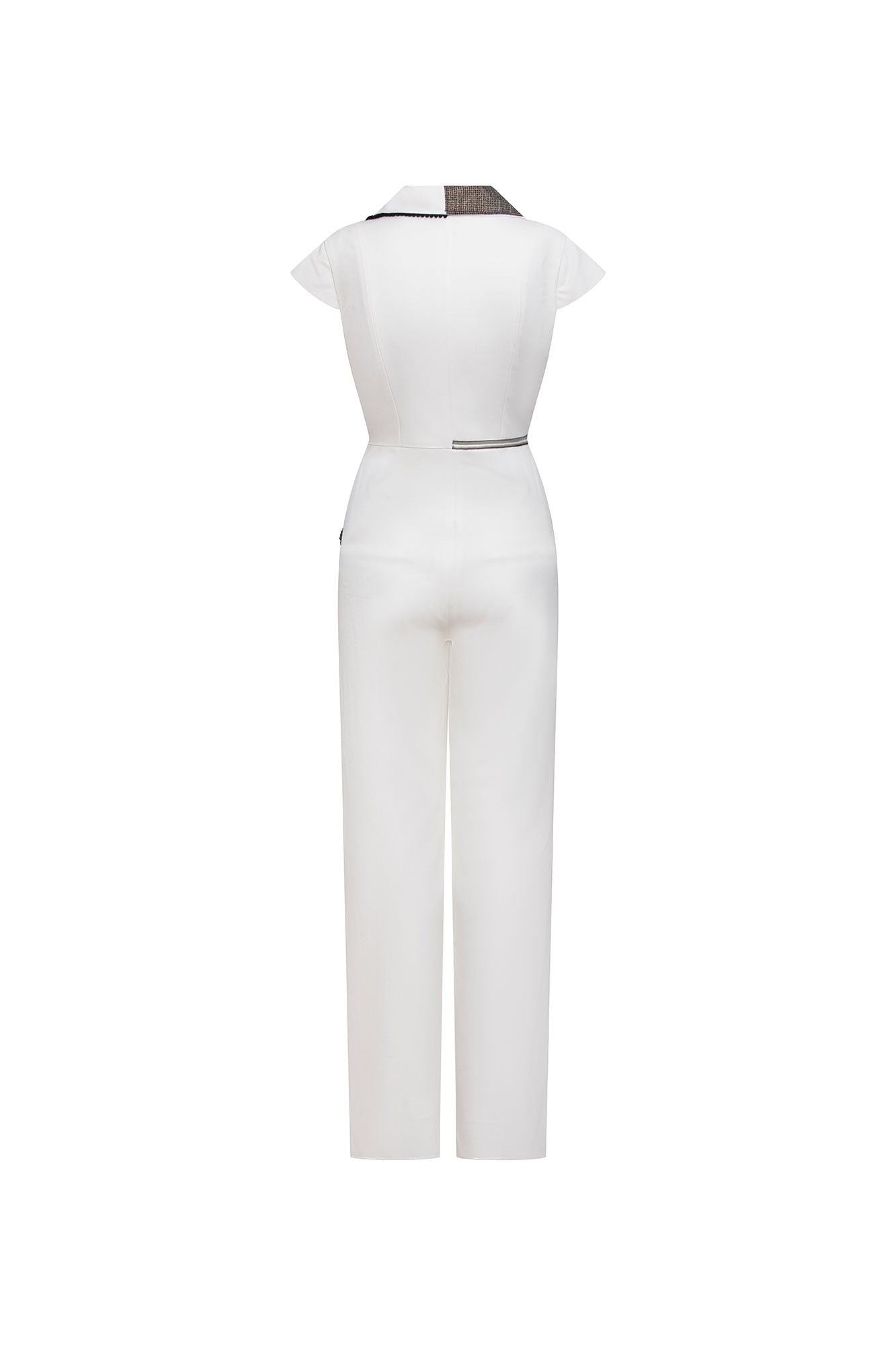 Enterizo en tono nácar de silueta contemporánea. El contraste del detalle frontal con pespuntes visibles y el cuello evocan sofisticación y carácter, creando una prenda versátil y atemporal que refleja la esencia de Bettina Spitz: sofisticación, comodidad y trabajo manual de lujo.