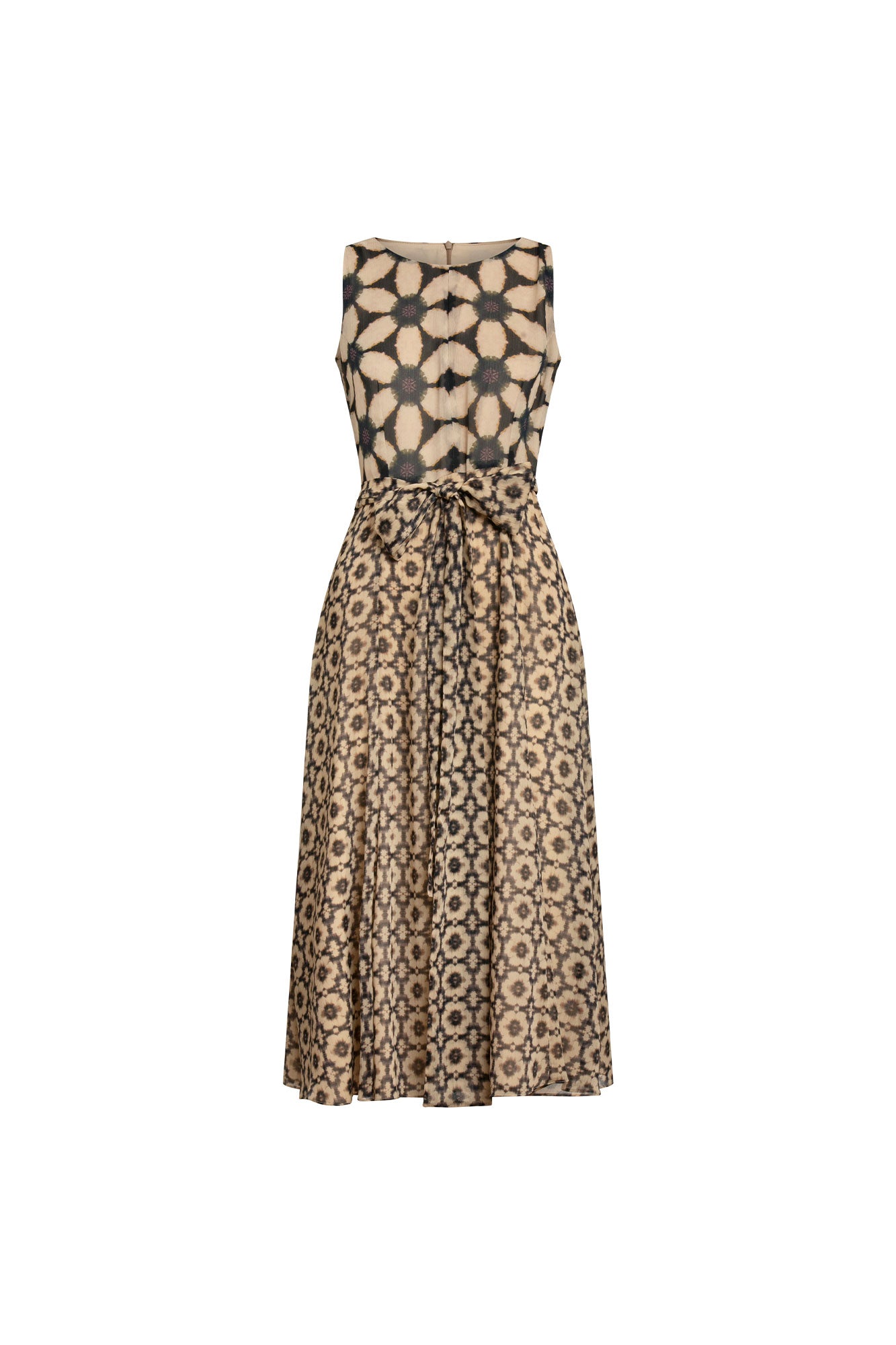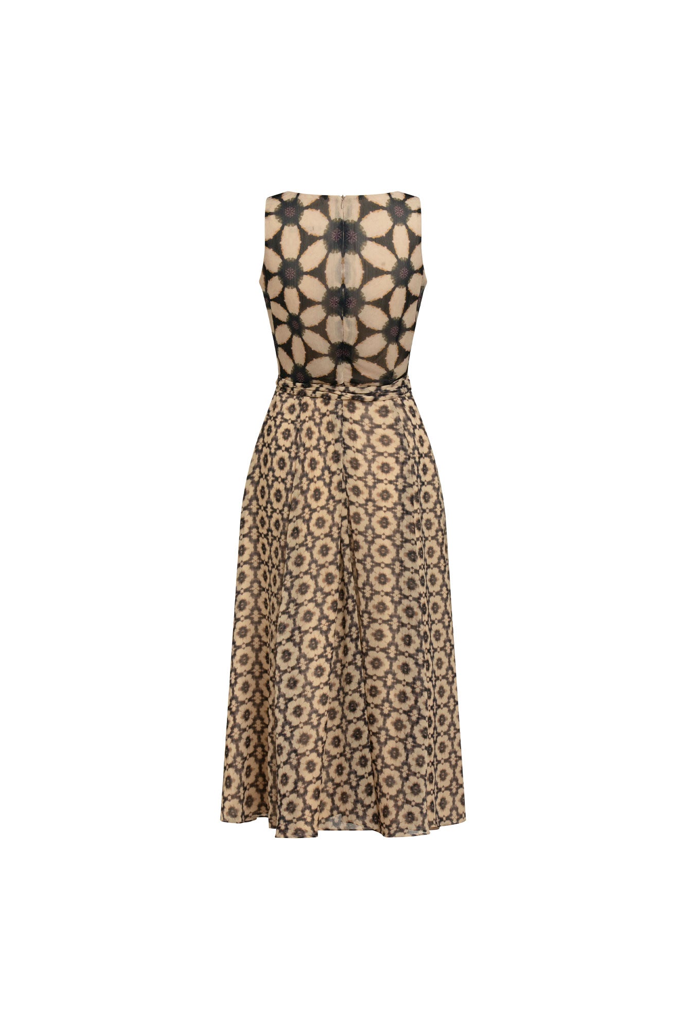 Silueta fluida realza la figura con sutileza, mientras el lazo en la cintura aporta definición y un toque femenino. El estampado tipo caleidoscopio le da un aire contemporáneo y artesanal, ideal para quienes buscan elegancia con personalidad.
